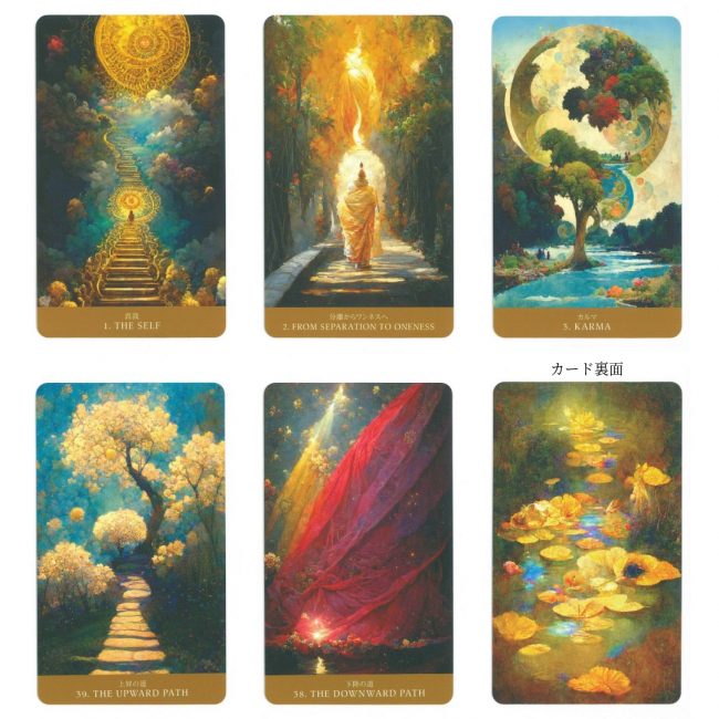 『パス オブ ライト・オラクル』は、その叡智を現代的な感性と直感の世界に融合させた、まったく新しいオラクルカードセットです。本作では、『ギーター』に息づくカルマ・ヨーガ(行為のヨーガ)、バクティ・ヨーガ(愛と献身のヨーガ)、そしてジュニャーナ・ヨーガ(智慧のヨーガ)のエッセンスを、カードの言葉とアートワークを通して体現しています。