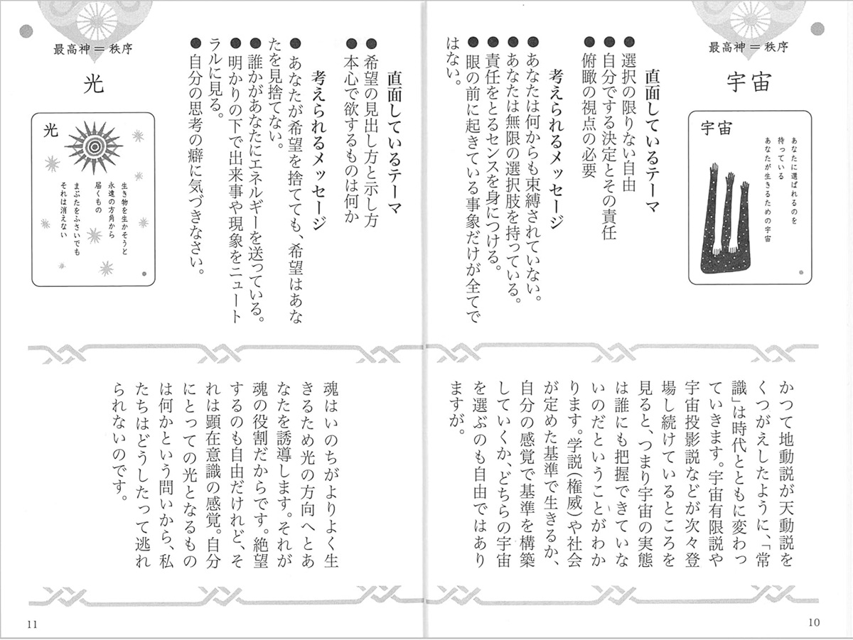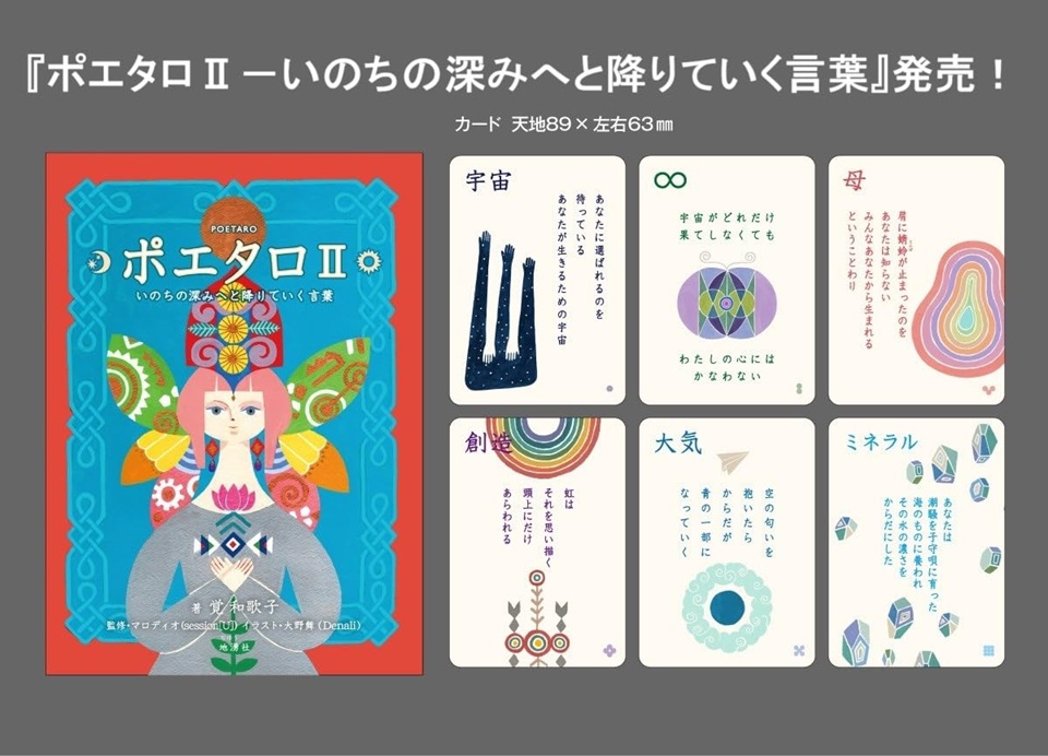 『ポエタロⅡ』は、宇宙・回転・創造・魂・気流・進化・交換・申請・受諾…など、目に見えないものを多くキーワード(エレメント)にしています。それぞれに短い詩文とイラストが添えられた64枚のカードで構成され、より深いあなたの内なる扉を開きます。詩文を読みとく解説書(75p)付き。