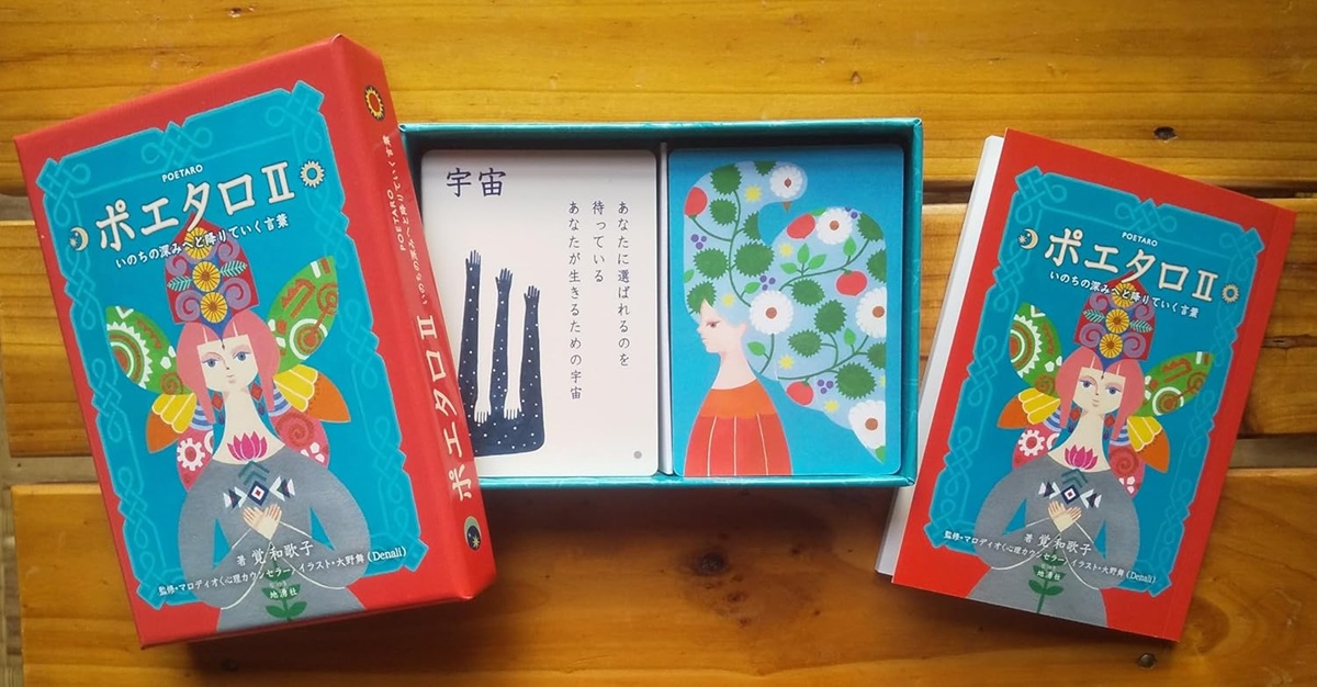 「ポエタロ」は真剣に問いかけながらカードを引くと、あなたにとって必要なメッセージをそこに読み取ることができる不思議なカード。詩人・作詞家の覚和歌子さんによる、インスピレーションに満ちた詩の言葉と、大野舞(デナリ)さんの素敵なイラストのコラボで生まれました。